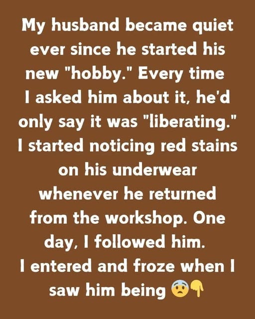My husband became unusually quiet ever since he started his new hobby. Whenever I asked him about it, he would only smile and say it felt “liberating.” I began to notice colorful smudges on his clothes whenever he returned from the workshop, which only deepened my curiosity.One day, I decided to follow him.