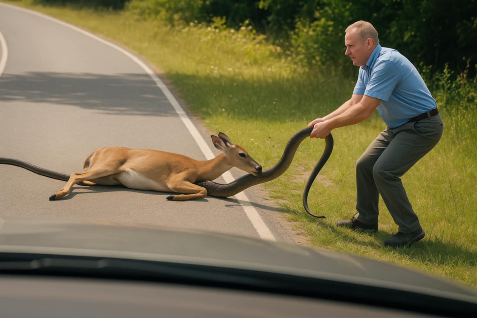 According to eyewitnesses, the event unfolded on a quiet rural road surrounded by dense vegetation. A man driving home noticed unusual movement near the roadside. When he slowed down and took a closer look, he was stunned to see a young deer struggling helplessly as it was being constricted by an enormous python. The snake had already wrapped its powerful coils tightly around the deer’s body, and every second counted if the animal was to survive.