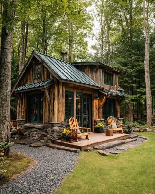 The image showcases a cozy cabin-style tiny abode, exuding rustic charm with its construction from natural materials. Wooden logs form the siding and a stone base anchors the structure, making it blend seamlessly with the forested surroundings. A dark green metal roof adds a contemporary flair while complementing the earthy hues of the wood. The front of the home is adorned with large windows that invite ample sunlight into the interior. An inviting porch, decorated with wooden Adirondack chairs and vibrant potted plants, offers a welcoming vibe. A tidy gravel path meanders through a lush lawn, leading to the porch steps, while tall, verdant trees encircle the cabin, enhancing the sense of peace and seclusion.