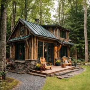 Nestled in the heart of a lush, verdant forest, this cozy cabin-style tiny home is a concept art piece that captures the imagination of those yearning for…