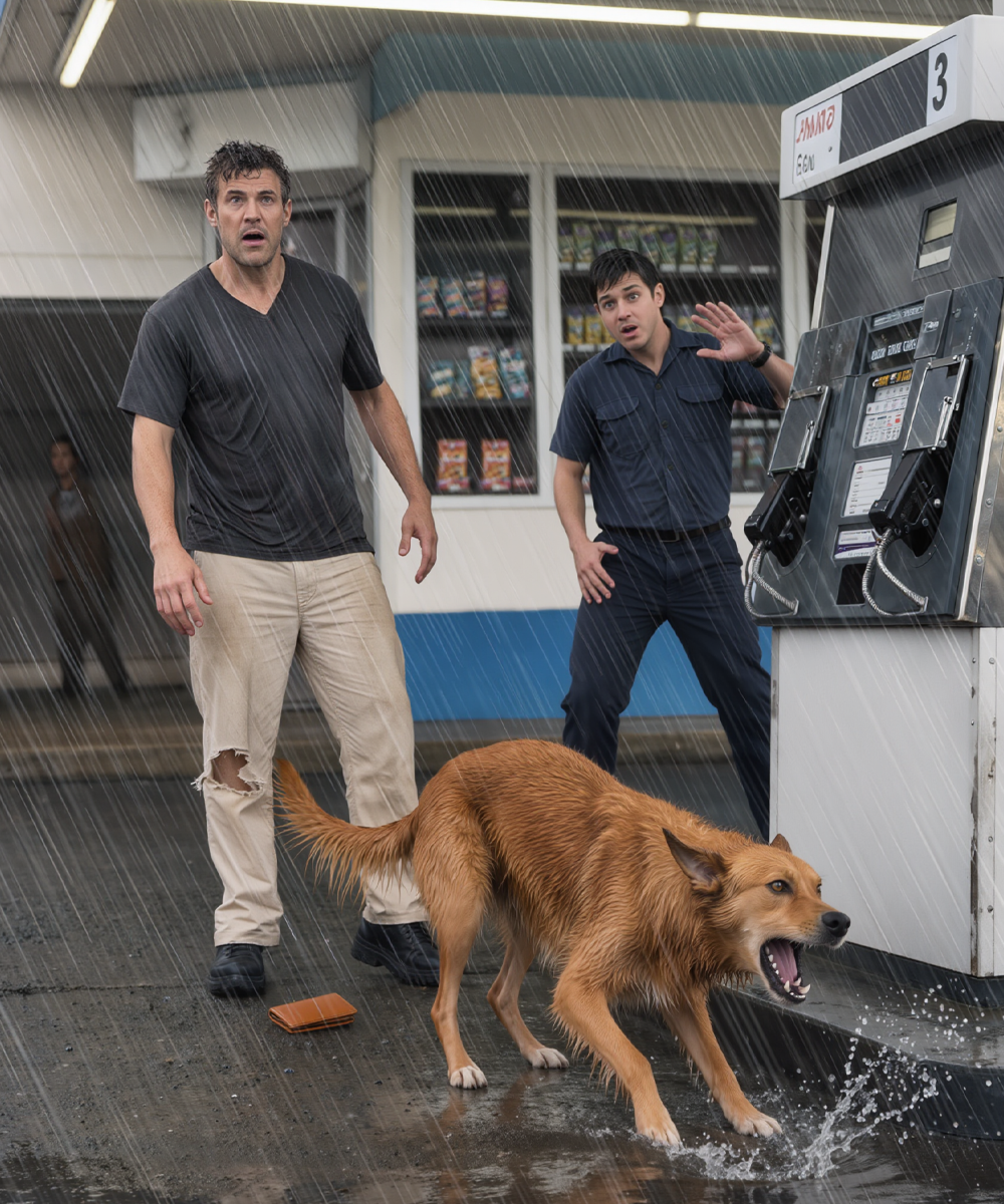 A reddish-brown dog stood squarely in front of Pump #3, rain dripping off his fur, eyes burning with something more than hunger. He barked again — sharp, urgent, almost desperate.