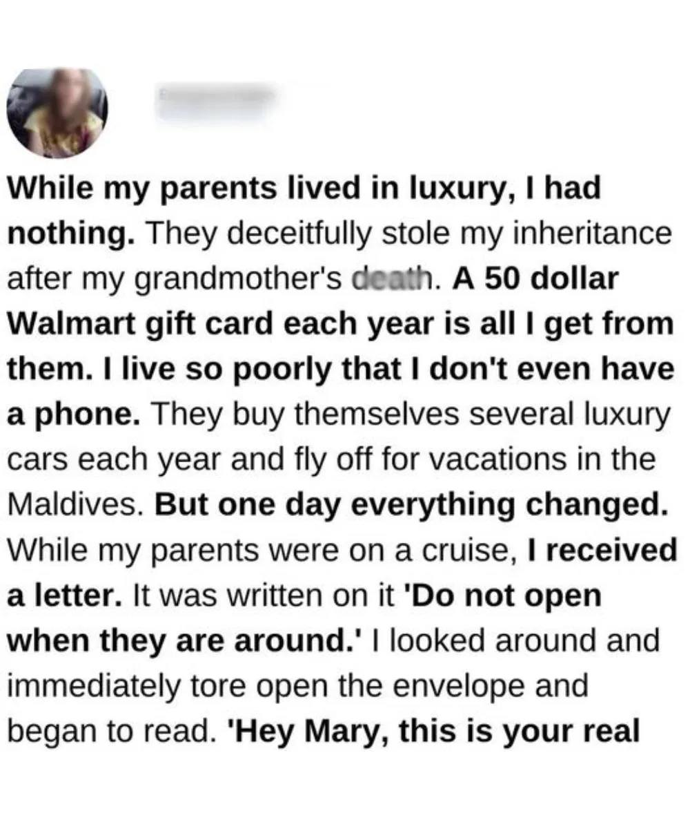 “Mary, this is your real father. I’ve been trying to find you for years. Your grandmother left you a large inheritance, and I’ve been fighting to get it back for you. Meet me at the address inside. It’s time for you to reclaim what’s yours and finally change your life.”