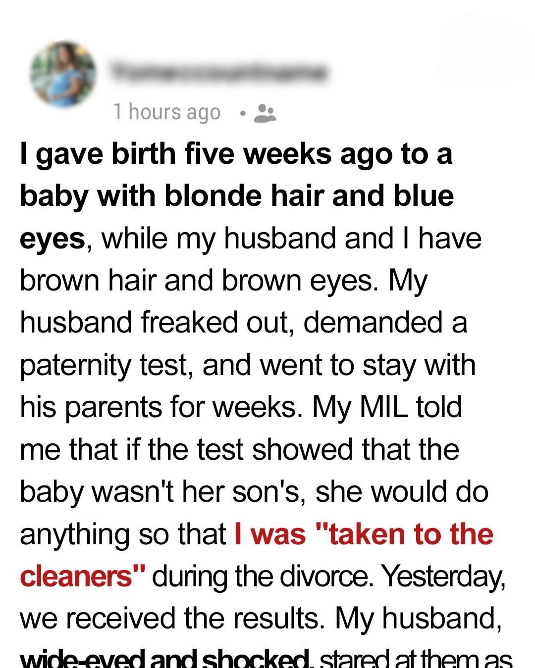 When I gave birth to our daughter Sarah, my husband Alex stared at her blue eyes and blonde hair and accused me of cheating. Hurt and shocked, I agreed to a paternity test. Instead of being by my side, he moved in with his parents, and his mother called to threaten me if Sarah “wasn’t his.” In that moment, the joy of motherhood was replaced by a fight for my dignity.