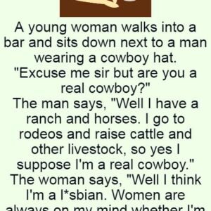 A young woman walks into a bar and sits down next to a man wearing a cowboy hat. “Excuse me sir but are you a real cowboy?”…