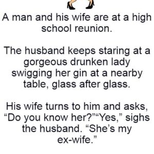 A man and his wife are at a high school reunion. The husband keeps staring at a gorgeous drunken lady swigging her gin at a nearby table,…